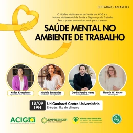 Visando o bem-estar e a produtividade no ambiente de trabalho, a Associação Comercial e Empresarial de Guarapuava (ACIG), através do Núcleo Multissetorial de Saúde da ACIG em conjunto com o Núcleo Multissetorial de Saúde e Segurança do Trabalho, realizam nesta quarta-feira (18), às 19h, no Centro Universitário UniGuairacá, o evento tem como tema: “Saúde Mental no Ambiente de Trabalho”, e tem objetivo de discutir a importância de um ambiente de trabalho saudável e equilibrado, sem questões que pesem no psicológico do colaborador, e tornem o trabalho um ofício que adoeça o trabalhador.